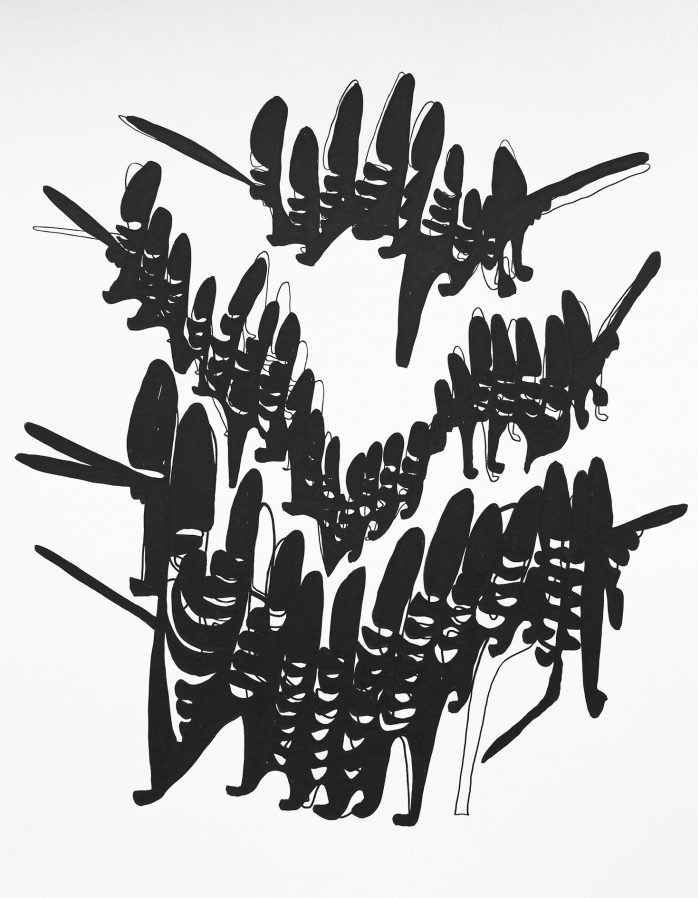 François Borie dessine, toujours, les formes répétitives de ses personnages qui se lient, s’emboitent à l’envie. Ce sont les mêmes personnages et pourtant toujours différents. On perçoit dans son univers ce désir obstiné de créer les variations d’un même thème. Un sentiment renforcé par la multiplicité de ses figures et de ses oeuvres. L’artiste crée une proximité entre le spectateur et ce ballet d’ombres en mouvement. Entre opacité et légèreté, dureté et apesanteur, le regard est engagé dans un jeu de mise en tension complexe dans lequel le vide et le plein semblent cohabiter dans le cadre même de l’oeuvre et de l’espace d’exposition.
