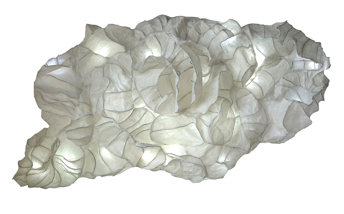 Le matériau utilisé, le papier japonais blanc, suggère l’éphémère et la fragilité, mais aussi une forme d’évanescence soulignée par leur apparente lévitation.