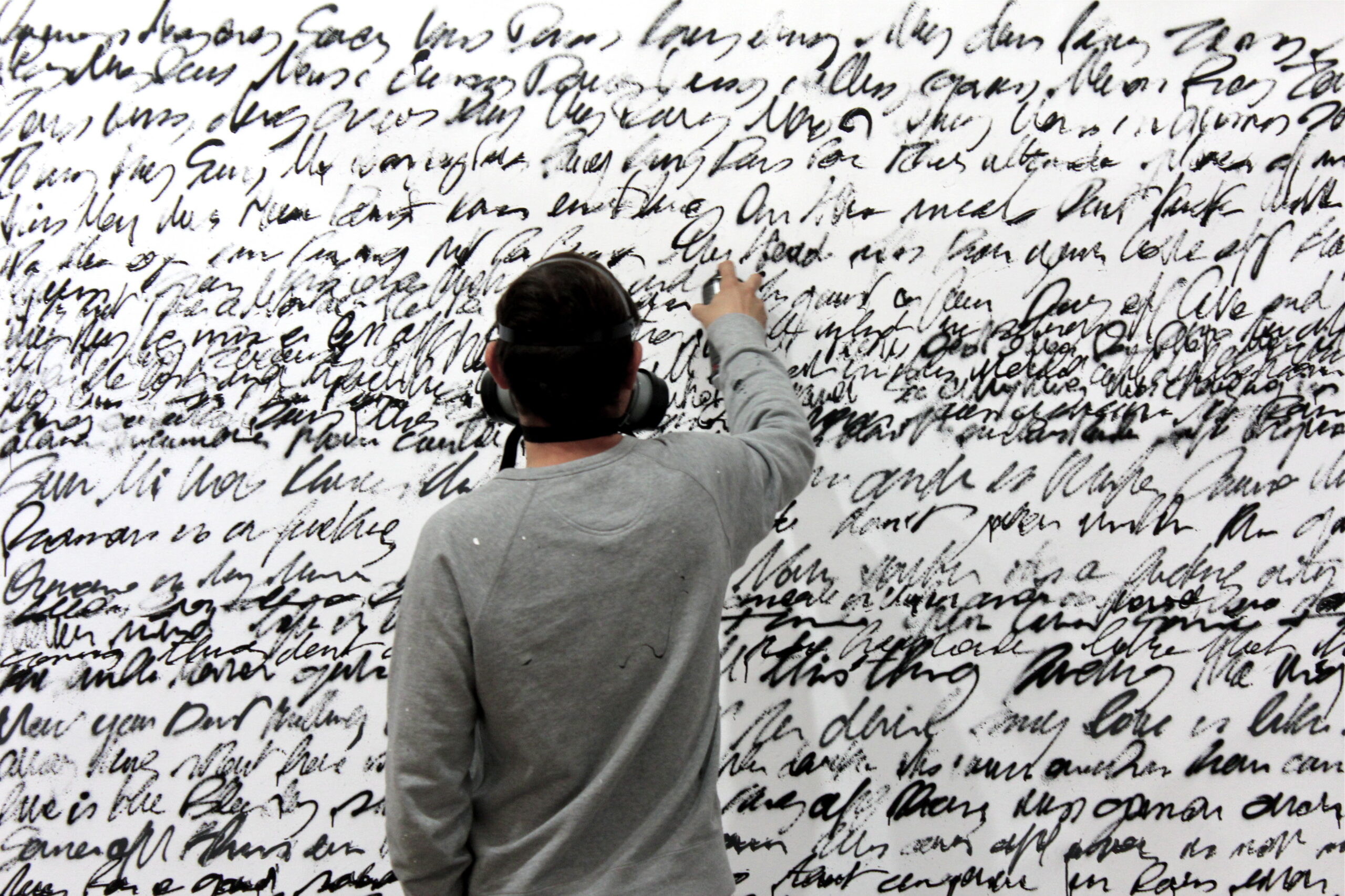 L’acte d’écriture s’apparente chez Tanc à une performance où il parvient à ce qu’il nomme lui-même « l’état de l’artiste », proche d’un état méditatif. Le geste devient alors si spontané qu’il se fait l’oscillographe de son rythme intérieur. « Je peins avec les battements de mon cœur » indique-t-il. Réalisant ses œuvres a fresco, sur de la peinture fraiche, il est soumis à la contrainte du temps et peint toujours d’une seule traite. Sa gestuelle s’apparente alors à une danse devant la toile ou une sorte de pratique d’un art martial à la fois zen et énergétique qui le poussent dans ses retranchements physiques. Les œuvres présentées dans l’exposition témoignent de la richesse et de la diversité de sa palette graphique. Tanc endosse le trait comme une seconde peau, spectateur de sa propre main. Le geste est libre et laisse jaillir la forme sans se laisser conditionner au résultat : lettres alphabétiques, idéogrammes, traits, boucles ou tout autre corps « dansant » s’accrochent et se répètent avec leurs embellissements, leurs emballements, leurs ralentissements sur cette « portée musicale ».