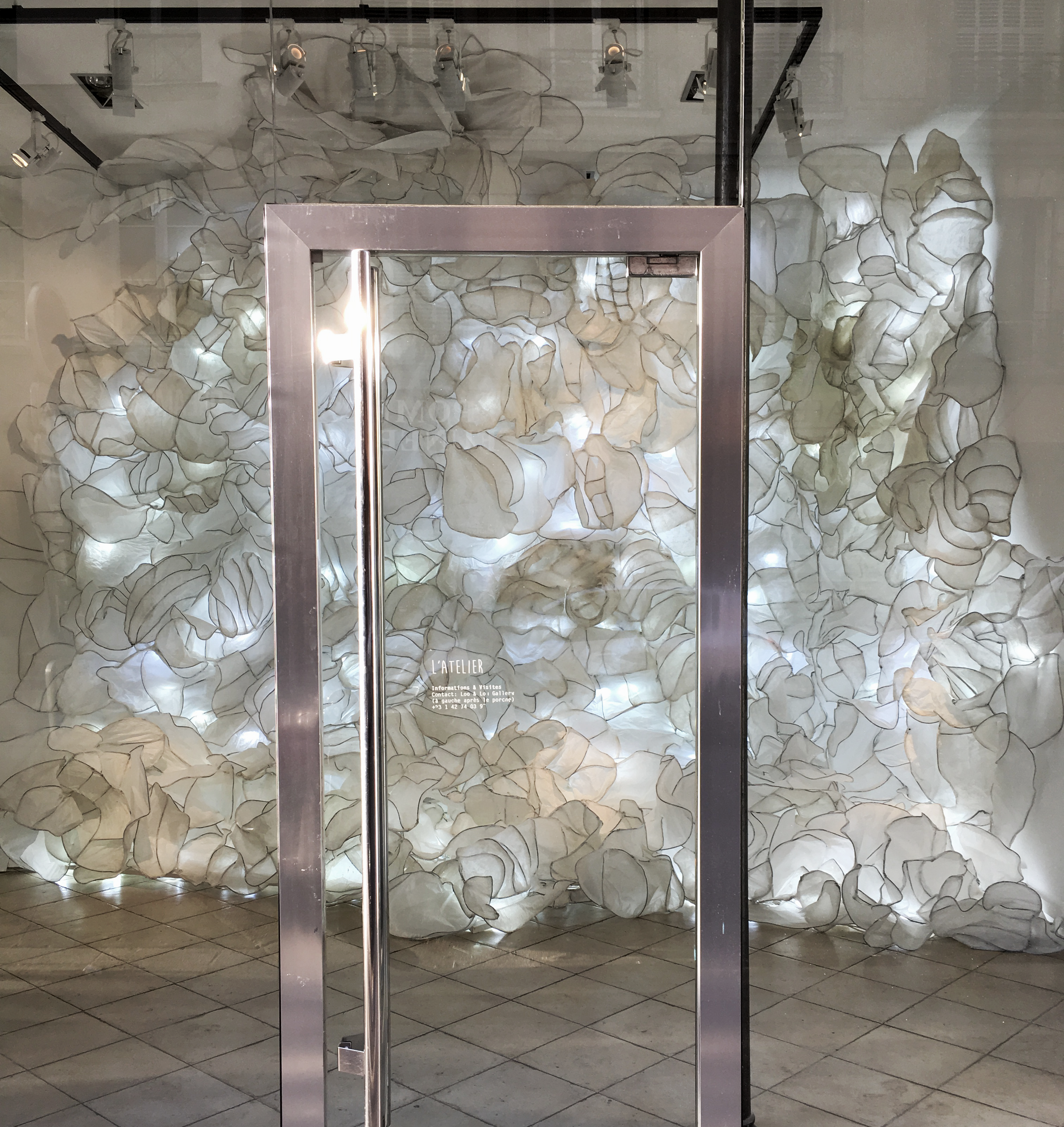Flo Arnold réalise pour l’Atelier une installation in-situ Vertige du Monde. Cette germination de flux organiques en papier rétro éclairés, sonorisée, vient dévorer l’espace telle une végétation luxuriante. L’architecture du lieu disparaît sous une cascade immaculée. La plasticienne souligne ici que chacun d’entre nous pour oublier le vertige du monde qui nous entoure doit vivre dans une sphère sans frontière, sans limite à la recherche d’une paix intérieure.